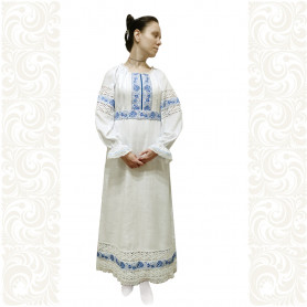 Характерное отличие юбки от любой другой в том, что она обычно изготавливается из трех кусков ткани прямоугольной формы, собранных на общем поясе. Понева выполнена изо льна черного цвета. Каждая часть поневы декорирована жаккардовой тесьмой и вьюнами внизу и по примеру. Примечательно, что широкая тесьма с цветочным узором, выполнена на основе исторического изображения, см. фото. Как правило, поневу надевают на длинную рубаху и подпоясывают тканым славянским поясом или поясом-шнурком.