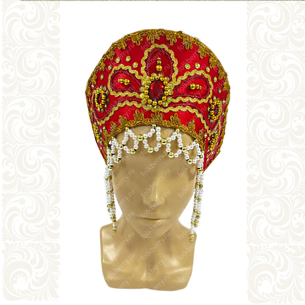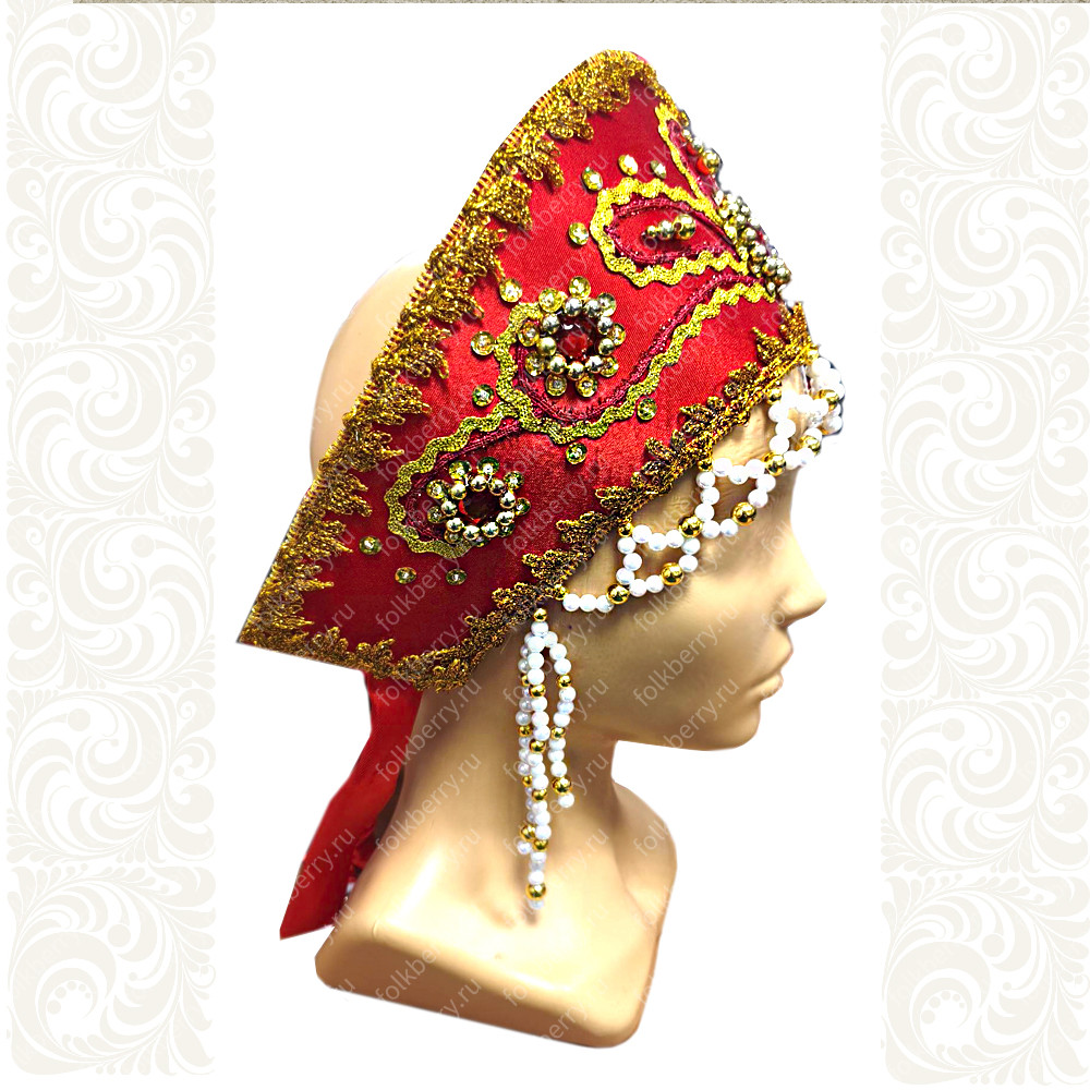 Кокошник выполнен на твёрдой основе, ткань – атлас (креп сатин), декорирован вьюном, тесьмой «завиток», а так же бусами, пайетками, и бисером, которые пришиты вручную. Высота изделия составляет над головой 12,5 см, ширина 27 см. Сзади кокошник крепится резинкой и атласной лентой, которая завязывается в бант. Возможно корпоративные сочетания цветов и нанесение Вашего логотипа.