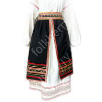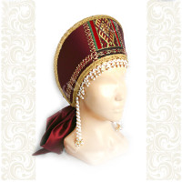 Кокошник выполнен на твёрдой основе, ткань – атлас (креп сатин), декорирован вьюном, тесьмой «завиток», а так же бусами, пайетками, и бисером, которые пришиты вручную. Высота изделия составляет над головой 12,5 см, ширина 27 см. Сзади кокошник крепится резинкой и атласной лентой, которая завязывается в бант. Возможно корпоративные сочетания цветов и нанесение Вашего логотипа.