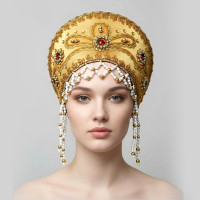 Кокошник выполнен на твёрдой основе, ткань – атлас (креп сатин), декорирован вьюном, тесьмой «завиток»,  а так же бусами, пайетками, и бисером, которые пришиты вручную. Высота изделия составляет над головой 12,5 см, ширина 27 см. Сзади кокошник крепится резинкой и атласной лентой, которая завязывается в бант. Возможно корпоративные сочетания цветов и нанесение Вашего логотипа.