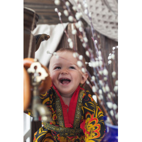 Косоворотка Оберег - выполнена из льна белого цвета, украшена жаккардовой лентой шириной 3 см синего цвета. Косоворотка смотрится стильно и современно, сочетается с современными элементами одежды, хотя содержит в себе элементы традиционного кроя и орнамента. В комплект входит пояс-кушак.