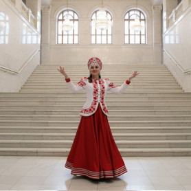 Платье Божена удлиненное ( миди, до щиколотки) станет отличным вариантом сценического костюма! Сочетание белого и красного цвет, длинная юбка  придают платью торжественности. Свободный силуэт, рукав реглан, регулируемая горловина добавляют вещи комфортности.