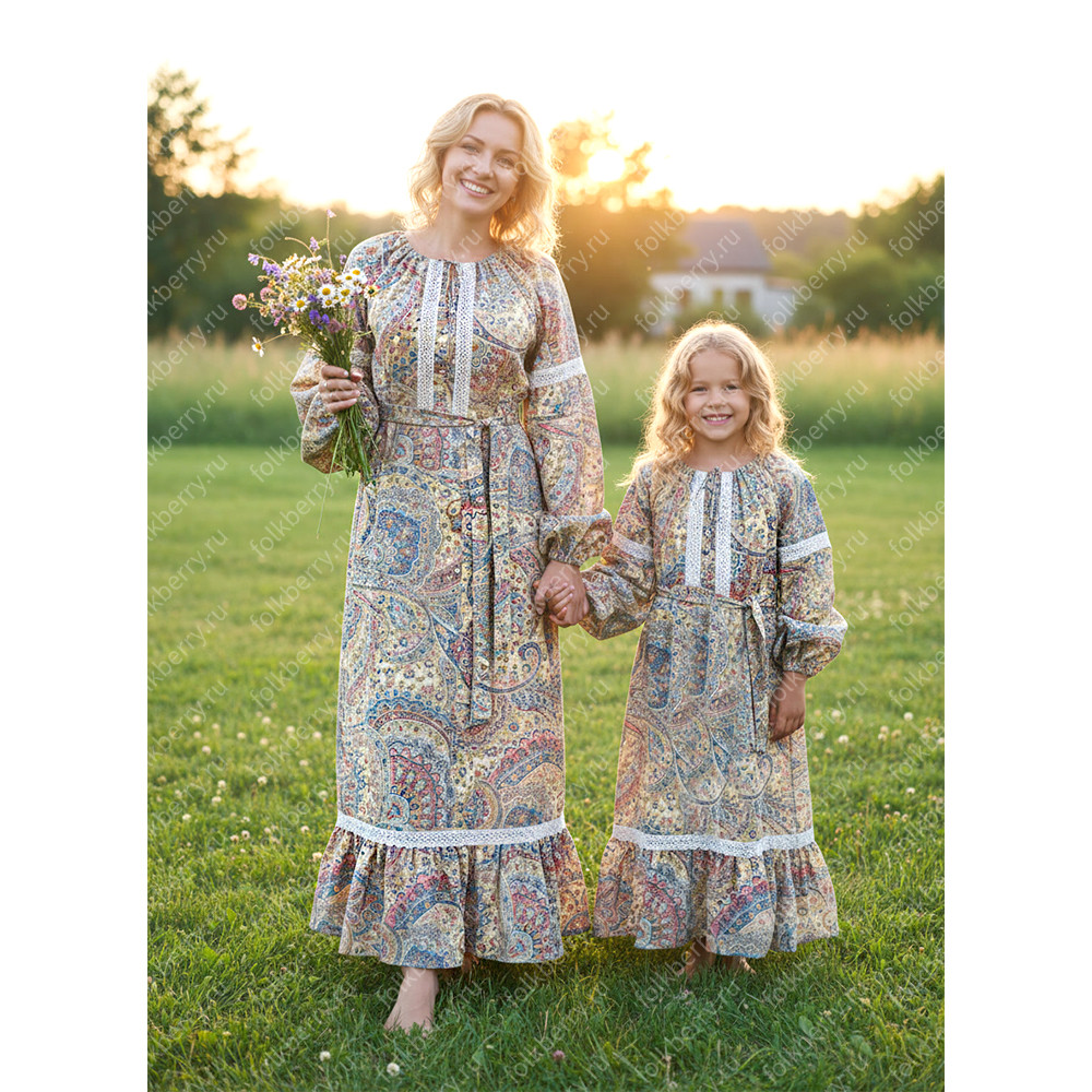 Фасон платья универсальный,поэтому удачен для девушек с разным типом фигуры. Горловину можно регулировать; рукав реглан, длинный, отрезной, широкий внизу; кокетка украшена кружевом; талия немного завышена; удлиненный и немного расклешенный силуэт; с поясом.