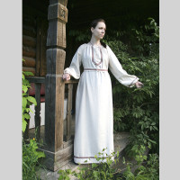 Платье "Таруся" выполнено из мягкого натурального льна благородного серебристого цвета, декорировано натуральным кружевом. Классический стиль, длина - миди, оригинальный полупояс и вытачки на спине мягко подчеркивают линии силуэта, длинный втачной рукав украшен кружевом.