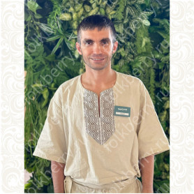Платье изготовлено из умягченного белого льна и украшено жаккардовой тесьмой с узорами Гжель и  белым кружевом разной ширины, а также бархоткой и  изысканной серебристой тонкой тесьмой. Платье силуэта А, расклешено к низу. В комплект входит  пояс с веревочками на концах. Рукава - удобный реглан, также декорированы кружевом и  жаккардовой тесьмой. Платье немного просвечивает, желательно надевать с легким подъюбником или юбкой-поневой.