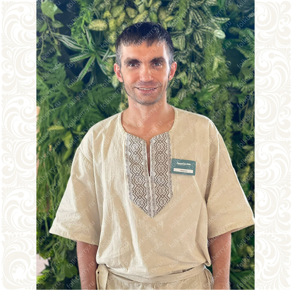 Рубаха мужская "Банька" предназначена для банщиков, массажистов и любителей бани и сауны. Сшита из мягкого комфортного льна светло-серого цвета, ткань натуральная, не окрашенная красками, дышащая, не колючая.