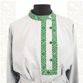 Фасон рубахи удобен и не ограничивает движения. Жесткий воротник, пуговицы отсутствуют, рукав втачной, немного спущенный, свободный, длина рукава примерно до локтя. По бокам внизу разрезы. К рубахе прилагается пояс. Декор на груди выполнен из жаккардовой тесьмы в натуральном цвете. Для подбора правильного размера, в заказе, пожалуйста, пишите рост, обхват груди и талии.