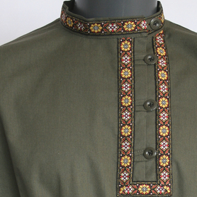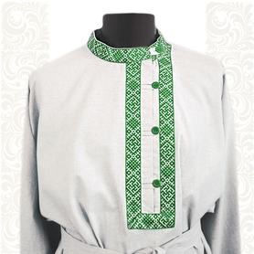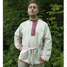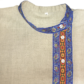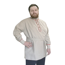 Рубаха мужская «Истоки» удобна в носке, так как выполнена из дышащей, легкой льняной ткани, с коротким втачным рукавом, свободной горловиной. Низ изделия, ворот и рукава украшает жаккардовая тесьма с обережным рисунком.