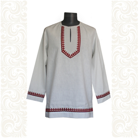 Мужская рубаха «Обряд» выполнена из белого льна, имеет втачной длинный рукав. По низу изделия, вороту и рукавам расположена жаккардовая золоченая тесьма с символами Христианства и воротником-стойкой. Дополняет рубаху кушак (пояс) из ткани с тесьмой.