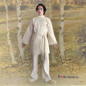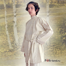 Льняная мужская рубаха «Истоки» с коротким втачным рукавом, прекрасно подойдет для проведения традиционных славянских праздников и выступлений. По вороту, низу изделия, рукавам расположен декор из жаккардовой тесьмы с обережным рисунком. Модель комплектуется кушаком (поясом) из ткани с тесьмой.