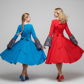 Сарафан выполнен из плотного габардина голубого ( бирюзового) цвета, имеет вставку из хлопка с рисунком «Гжель». Юбка красиво раскрывается в танце. Ткань не блестит, не мнется.