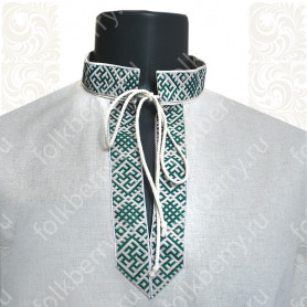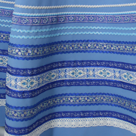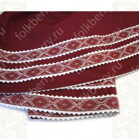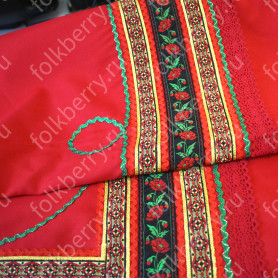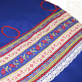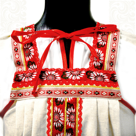 Сарафан декорирован широкой полосой жаккардовой тесьмы, золотистого шнура, вьюнка, кружева, что придает изделию дополнительные шик и торжественность.