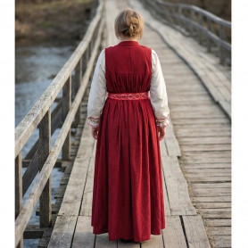 Сарафан состоит из кокетки спереди и сзади; бретелей, которые можно регулировать по длине; юбки-солнце средней длины с пышной оборкой. Сарафан выполнен из ткани габардин и украшен жаккардовой тесьмой, вьюнчиком.