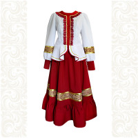 Характерное отличие поневы от любой другой юбки в том, что она обычно изготавливается из трех кусков ткани прямоугольной формы, собранных на общем поясе. Понева выполнена изо льна черного цвета. Каждая часть поневы декорирована жаккардовой тесьмой и вьюнами внизу и по примеру. Примечательно, что широкая тесьма с цветочным узором, выполнена на основе исторического изображения, см. фото. Как правило, поневу надевают на длинную рубаху и подпоясывают тканым славянским поясом или поясом-шнурком.