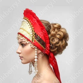 3. Кокошник выполнен из парчи, кружева, страз. К кокошнику прилагаются полупрозрачная фата и длинные бусы-подвески. Высота кокошника 13 см. Сзади ленты-крылья. Кокошник легкий и удобный.