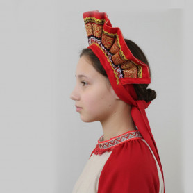 Костюм  выполнен из габардина и красиво подобранного декора в золотистых цветах. Достоинства габардина  в том, что он не мнется, не блестит, как атлас, ложится красивыми  мягкими складками, цвет не выгорает. Юбка  с оборкой, декор в золотистых цветах, по талии на  двойной резинке. Блуза  белого праздничного цвета, с баской,  рукава расширены внизу, с манжетами.   Сзади на блузе шнуровка. Она дает хорошую посадку по фигуре. Костюм предназначен для творческих  сольных и коллективных театральных выступлений.
